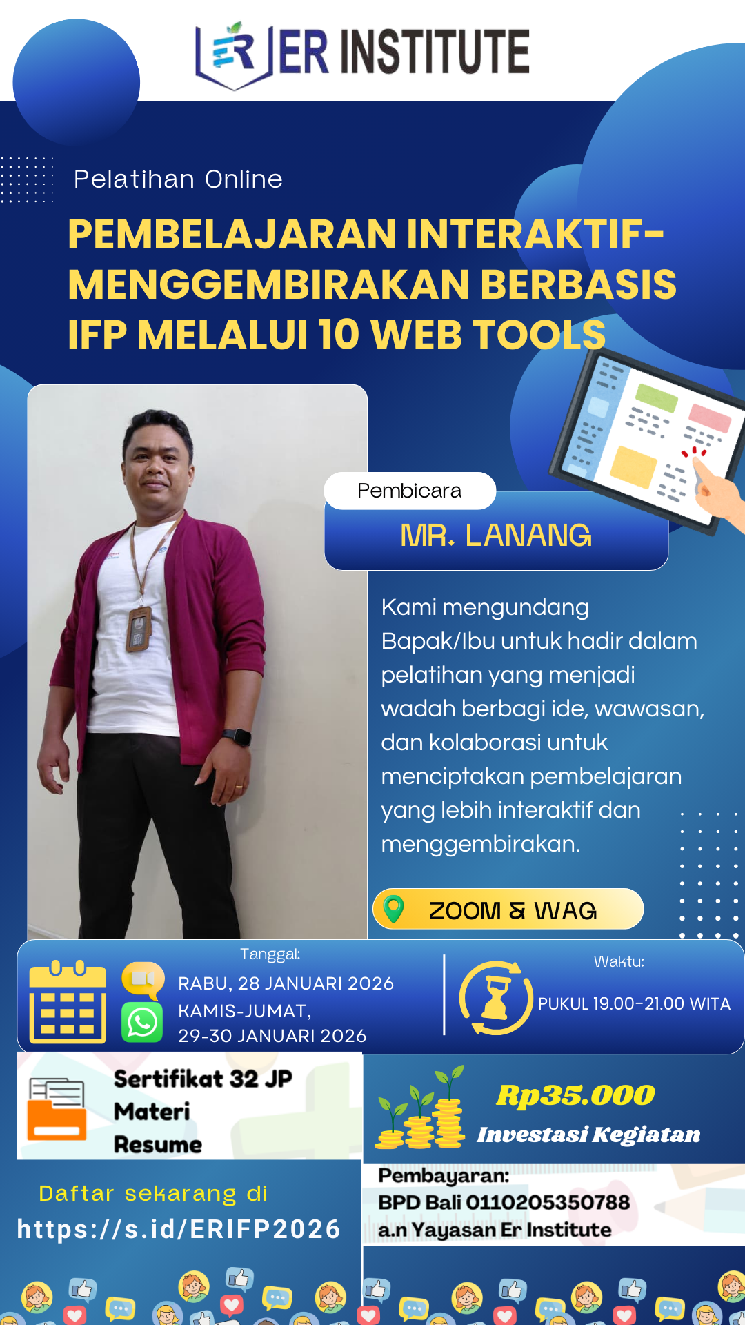 Yuk, tingkatkan kompetensi agar pembelajaran semakin interaktif dan menggembirakan menggunakan Papan Interaktif Digital dengan 10 ++ web tools. π RabuβJumat, 28β30 Januari 2026 π 19.00β21.00 WITA π Online Zoom & WhatsApp Group π₯ Kenapa HARUS ikut? β Paham peran strategis PID/IFP dalam pembelajaran β Menguasai 10 web tools pendukung pembelajaran interaktif β Kelas lebih hidup, murid lebih terlibat β Praktis, aplikatif, dan siap diterapkan β Sertifikat 32 JP πΈ Investasi hanya Rp35.000 β Amankan kursi Anda sekarang: π Daftar di https://s.id/ERIFP2026 π Tautan Zoom akan dibagikan melalui Group WhatsApp saat hari pelatihan.