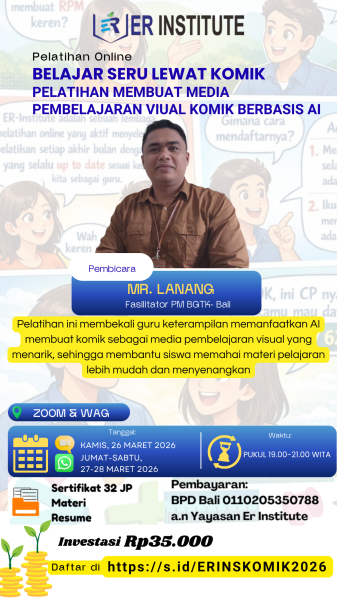 Bosan dengan media pembelajaran yang itu-itu saja? Ingin bikin siswa lebih antusias dan fokus di kelas? Yuk, tingkatkan kompetensi bersama ER INSTITUTE dalam Pelatihan Online: β¨ "BELAJAR SERU LEWAT KOMIK: Pelatihan Membuat Media Pembelajaran Visual Komik Berbasis AI" β¨ Bersama Mr. Lanang (Fasilitator PM BGTK - Bali), kita akan belajar cara praktis menyulap materi pelajaran yang rumit menjadi komik visual yang menarik dengan bantuan AI. Siswa dijamin lebih mudah paham dan belajar jadi jauh lebih menyenangkan! π Catat tanggal penting! π KamisβSabtu, 26β28 Maret 2026 π 19.00β21.00 WITA π Online Zoom & WhatsApp Group π₯ Kenapa HARUS ikut? Visual Inovatif: Sulap materi kaku menjadi komik menarik. Siswa Antusias: Belajar jadi jauh lebih seru dan mudah dipahami. Fasilitas: Sertifikat 32 JP, Materi, & Resume. πΈ Investasi hanya Rp35.000 β Amankan kursi Anda sekarang: π Daftar di: https://s.id/ERINSKOMIK2026 Kuota terbatas dan cepat